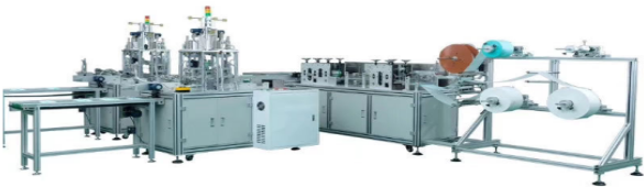 1.This machine can produce 1 to 4 layers face mask made of non-woven fabrics, with high output, low rejection rate and easy to be used. It’s adjustable in specification of product, like the thickness (in a limit extent) and the nose-shaping metal bar of face mask. By changing the mould, it can produce face mask of any length and any standard. For example, face mask with one of two nose-shaping metal bar can be made. Putting covered yarn and rubber band into the conveyer case, the machine will convey, cut and seal rubber band automatically. It can also complete belt pointing once. The surface of machine is made of aluminum alloy structure.
